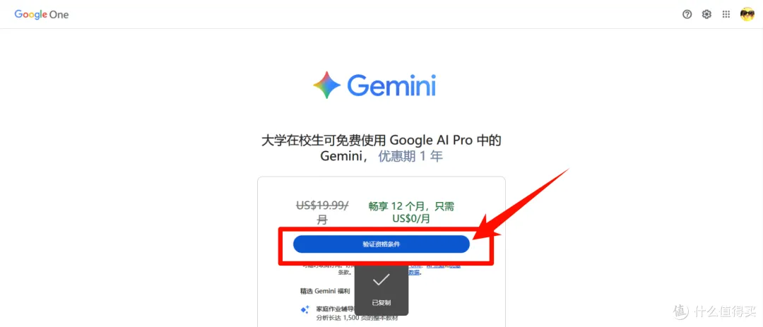 进入后会提示你验证完学生资格后可以享受0元使用1年的Gemini Pro ,我们直接复制【验证资格条件】的链接地址