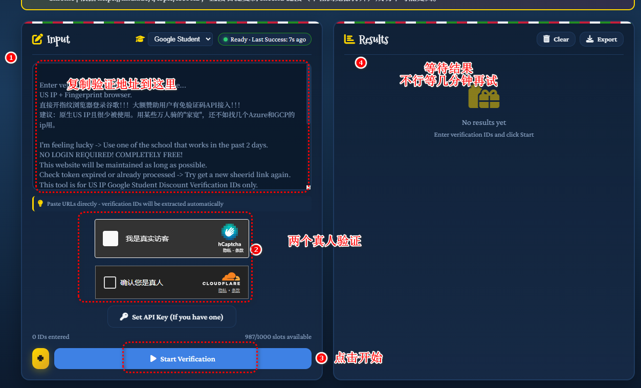 把刚才复制的URL黏贴到输入框中,然后按照顺序点击【Start Verification】。点击后等待右边处理,如果显示【Success】就正常验证学生身份了,如果Failed 就多试几次。